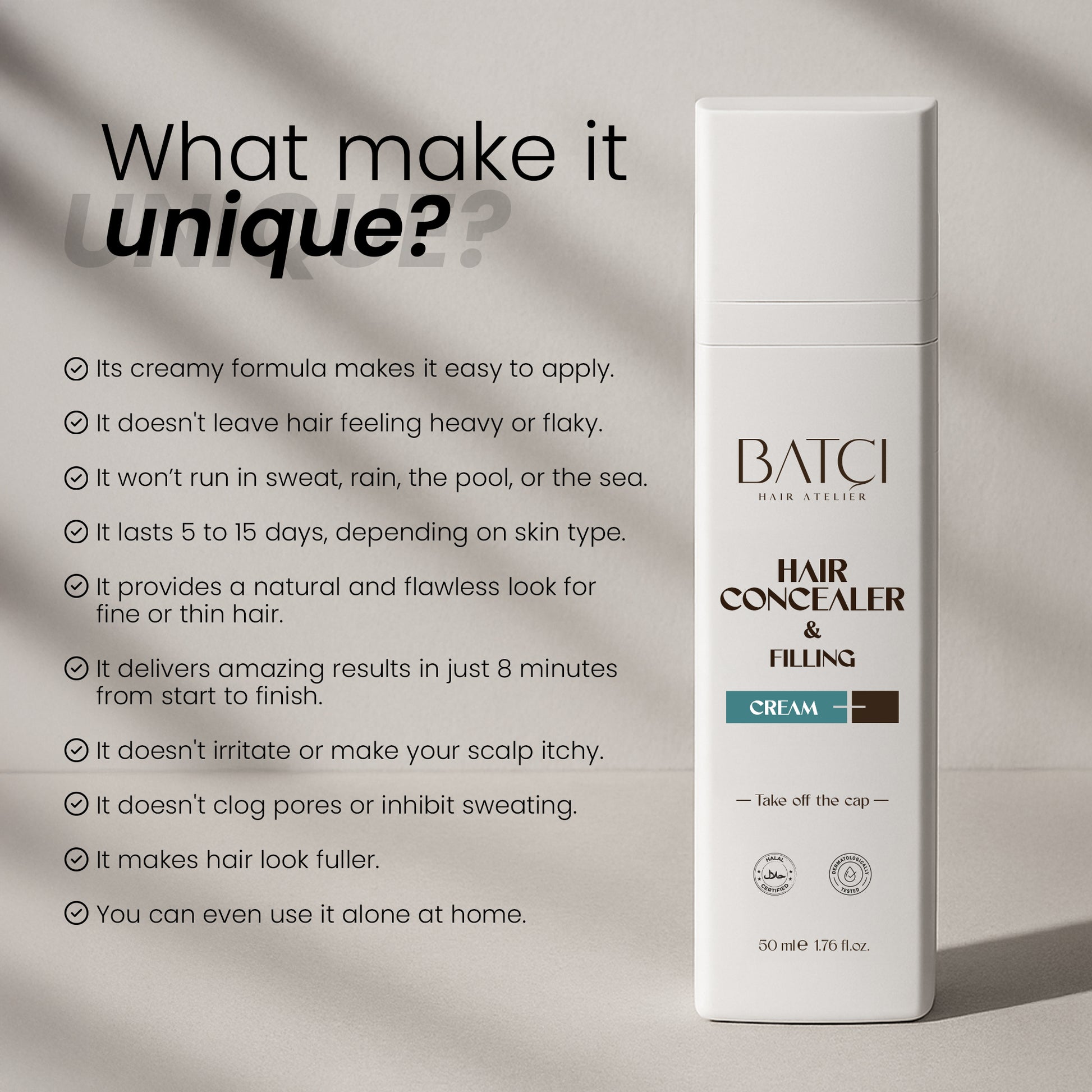 La formule bio et naturelle de BATCI facilite son utilisation quotidienne. Contrairement aux autres poudres et sprays, sa formule crème pénètre instantanément dans le cuir chevelu et offre une couvrance uniforme, sans pellicules, desquamations ni bavures. Elle crée un look propre, mat et naturel. Résistant à l'eau et à la transpiration, il est conçu pour tenir des heures, toute la journée. L'anti-cernes BATCI conserve son effet longue durée au travail, en réunion, en voyage et même après l'effort, pour une sensation de confiance tout au long de la journée.