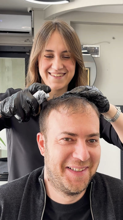 Commencez par une petite quantité et massez délicatement les zones clairsemées. Étalez la crème uniformément sur les zones clairsemées à l'aide d'un peigne ou du bout des doigts. Pour un résultat naturel, appliquez une couche fine et progressive.